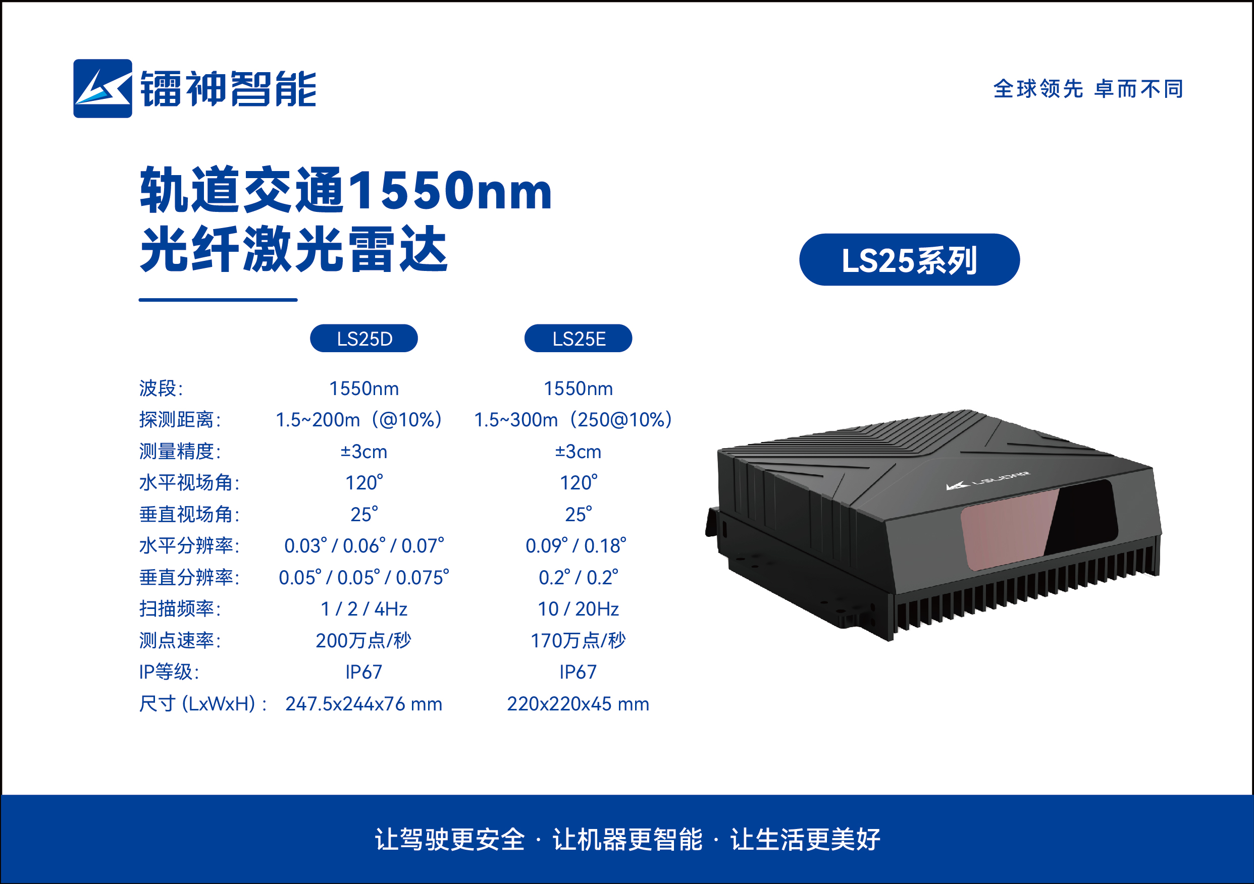 鐳神智能賦能軌道交通所用激光雷達擁有1550nm及905nm兩種光源配置可選,均采用車規(guī)標準設(shè)計,且在尺寸、功耗、功能安全、成本等進行了全面整合優(yōu)化,通過一系列嚴苛測試,可采用定點式安裝或車載式安裝兩種安裝方案。