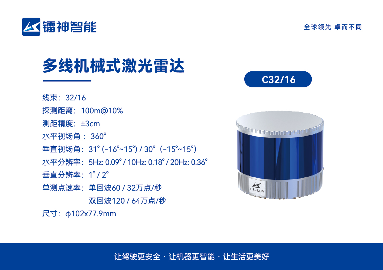 多線(xiàn)機(jī)械式激光雷達(dá)C32/C16:?C32/C16探測(cè)距離均為100@10%,水平掃描角度360°,垂直掃描角度為30°左右,C32測(cè)點(diǎn)速率為60萬(wàn)點(diǎn)/秒;C16測(cè)點(diǎn)速率為32萬(wàn)點(diǎn)/秒,可快速搭建百萬(wàn)平3D立體的作業(yè)環(huán)境點(diǎn)云模型,幫助無(wú)人叉車(chē)、AGV、AMR、機(jī)器人等自動(dòng)化設(shè)備實(shí)現(xiàn)定位導(dǎo)航及3D立體防護(hù)。