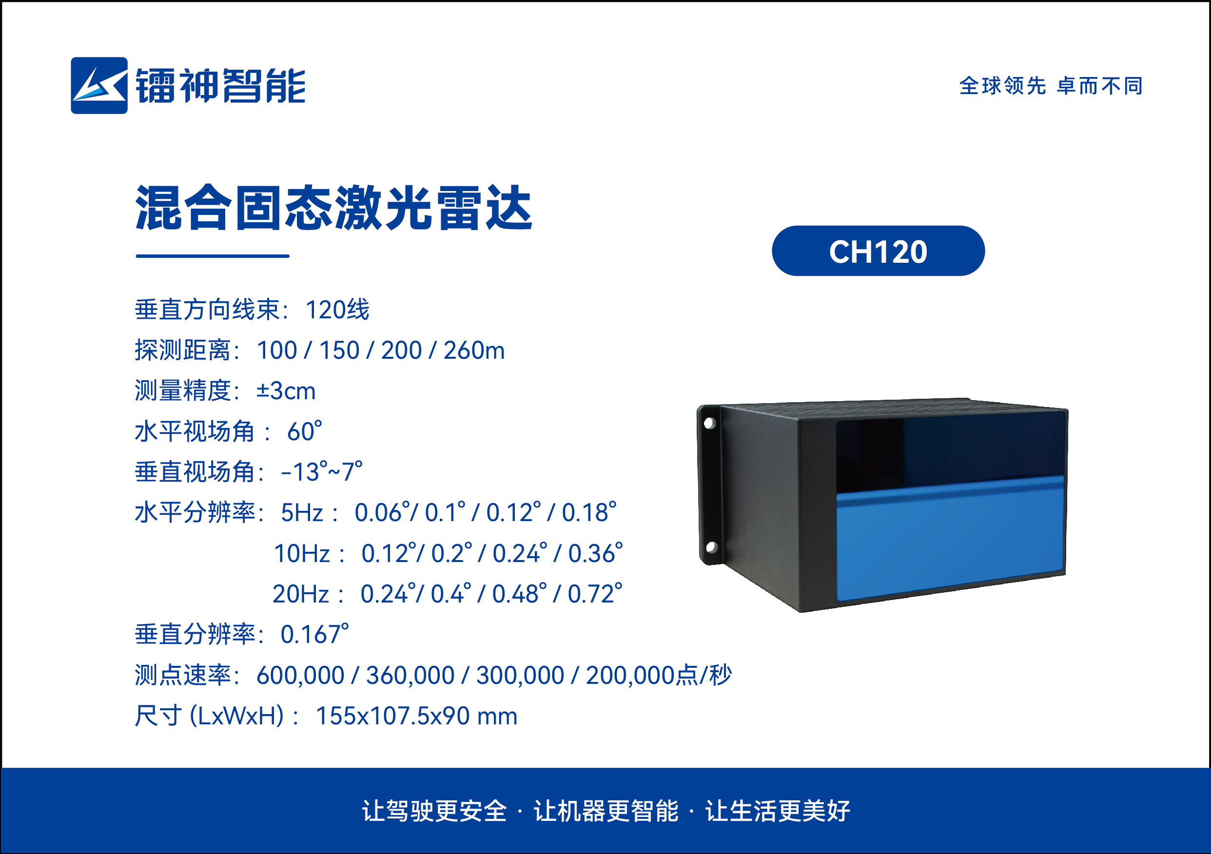 本案例應(yīng)用的是車規(guī)混合固態(tài)激光雷達(dá)CH128X1,探測(cè)距離可達(dá)200m (160m@10%),F(xiàn)OV為120°x25°,測(cè)點(diǎn)速率可達(dá)76萬(wàn)點(diǎn)/秒,分辨率最高可達(dá)0.1°(H)x0.125@ROI(V)。(除CH128X1外,客戶也可根據(jù)需求選用LS系列,終結(jié)者一號(hào)CX系列、CH128X1、C32等十余款激光雷達(dá)型號(hào))