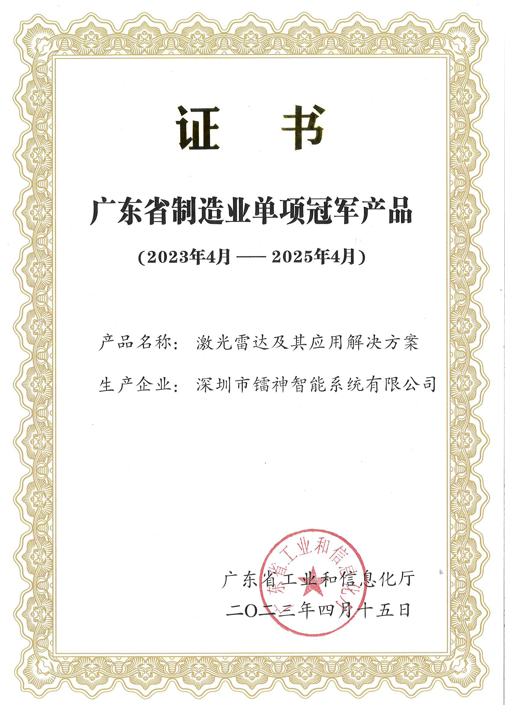 近日,廣東省工業(yè)和信息化局在深圳隆重舉行“2022年省級(jí)制造業(yè)單項(xiàng)冠軍企業(yè)(產(chǎn)品)”授證儀式,鐳神智能激光雷達(dá)及其應(yīng)用解決方案榮獲“廣東省制造業(yè)單項(xiàng)冠軍產(chǎn)品”稱號(hào)。