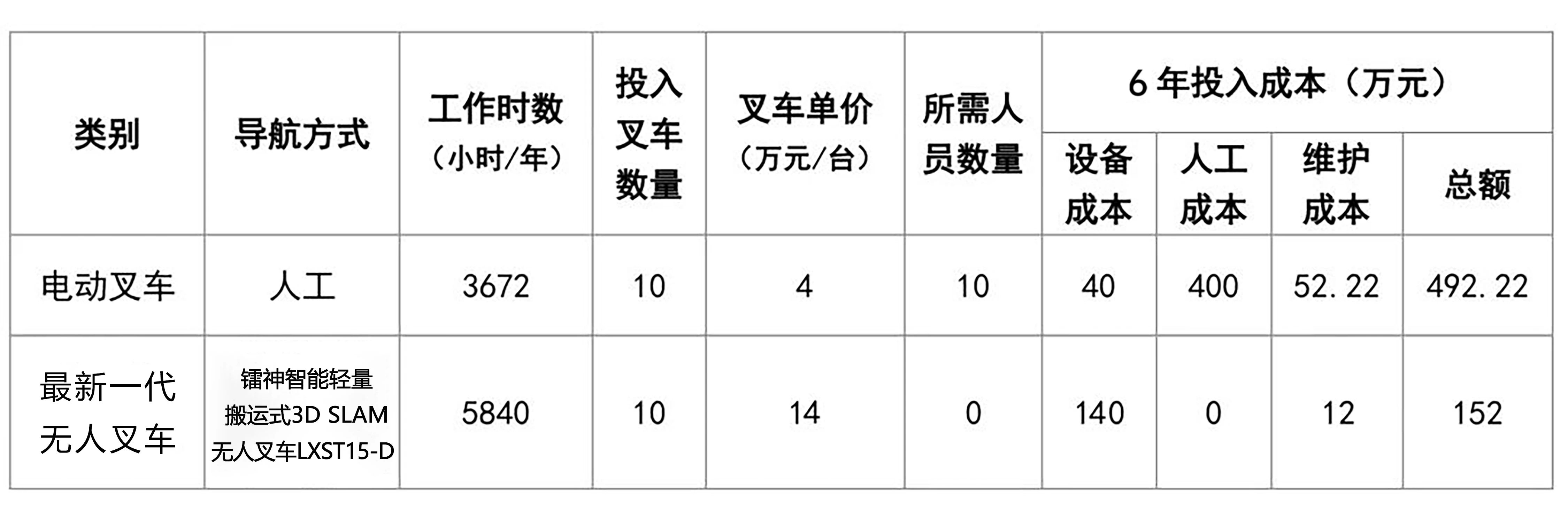 上表假定某倉庫分別投入10輛電動叉車、以鐳神智能輕量搬運(yùn)式3D SLAM無人叉車LXST15-D為例,并以6年折舊進(jìn)行投資回報對比分析。采用鐳神智能LXST15-D無人叉車,6年總投入成本僅152萬,比人工電動叉車節(jié)省了69%的投入成本、59%的時間成本。