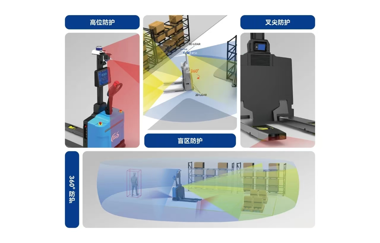 3、全方位安全防護(hù):鐳神智能機(jī)器人3D SLAM無人叉車最高配置7顆激光雷達(dá),360°全方位覆蓋確保了叉車在運(yùn)行過程中的安全性。