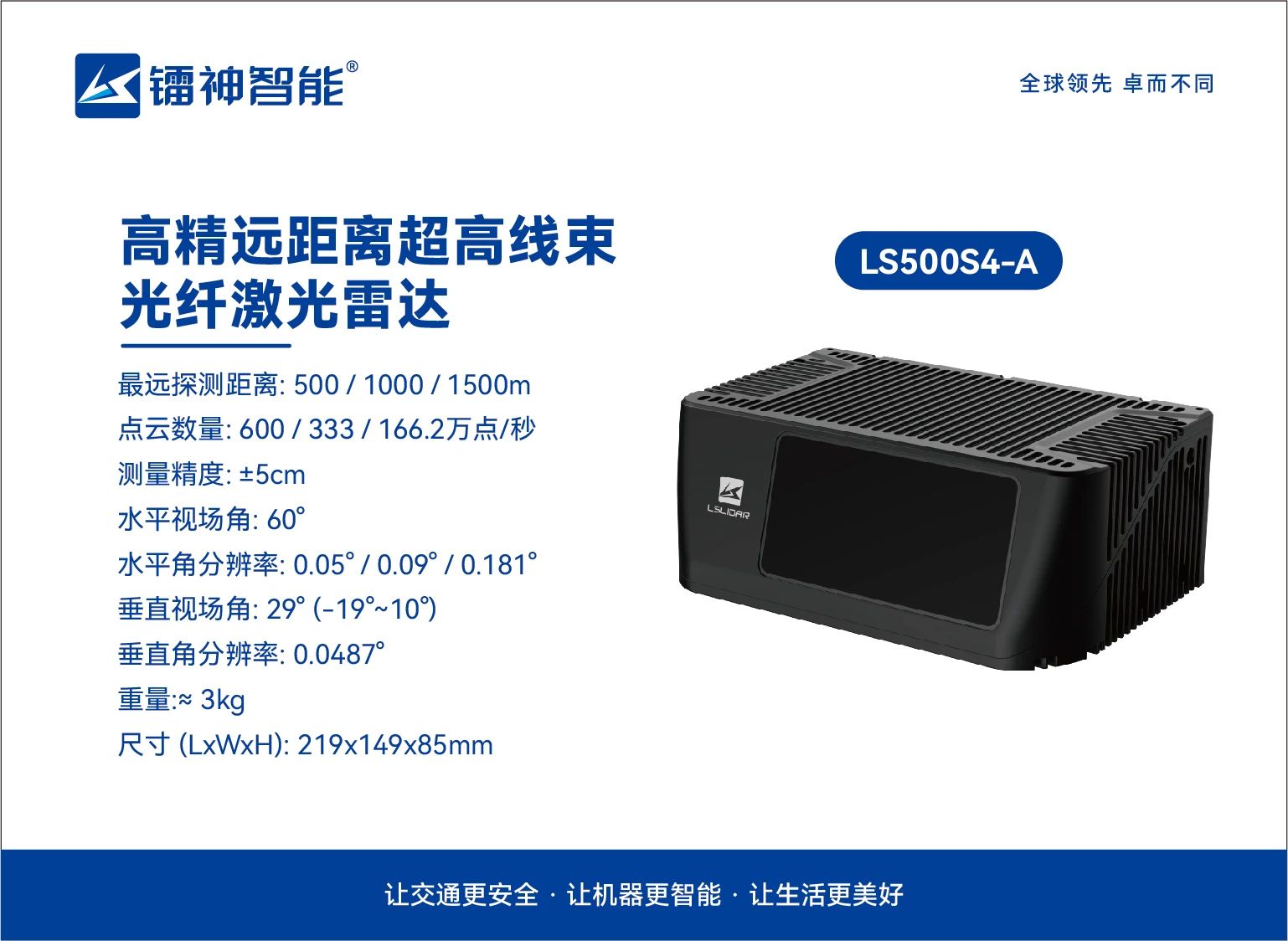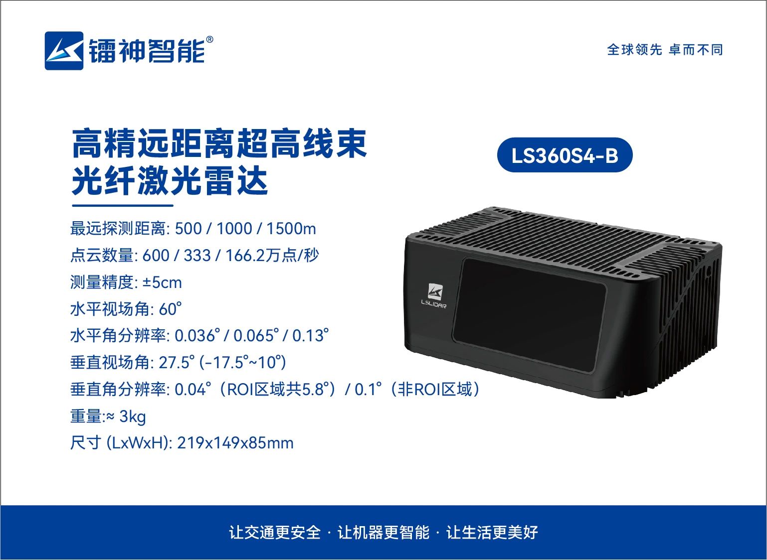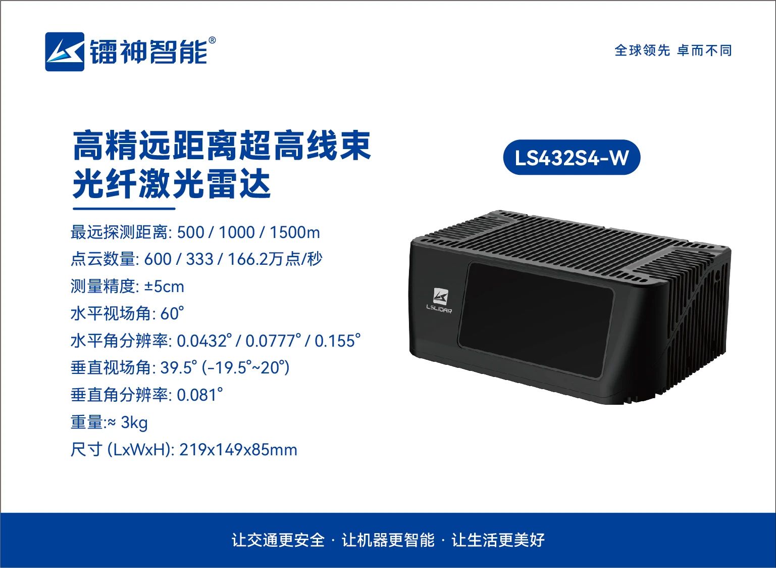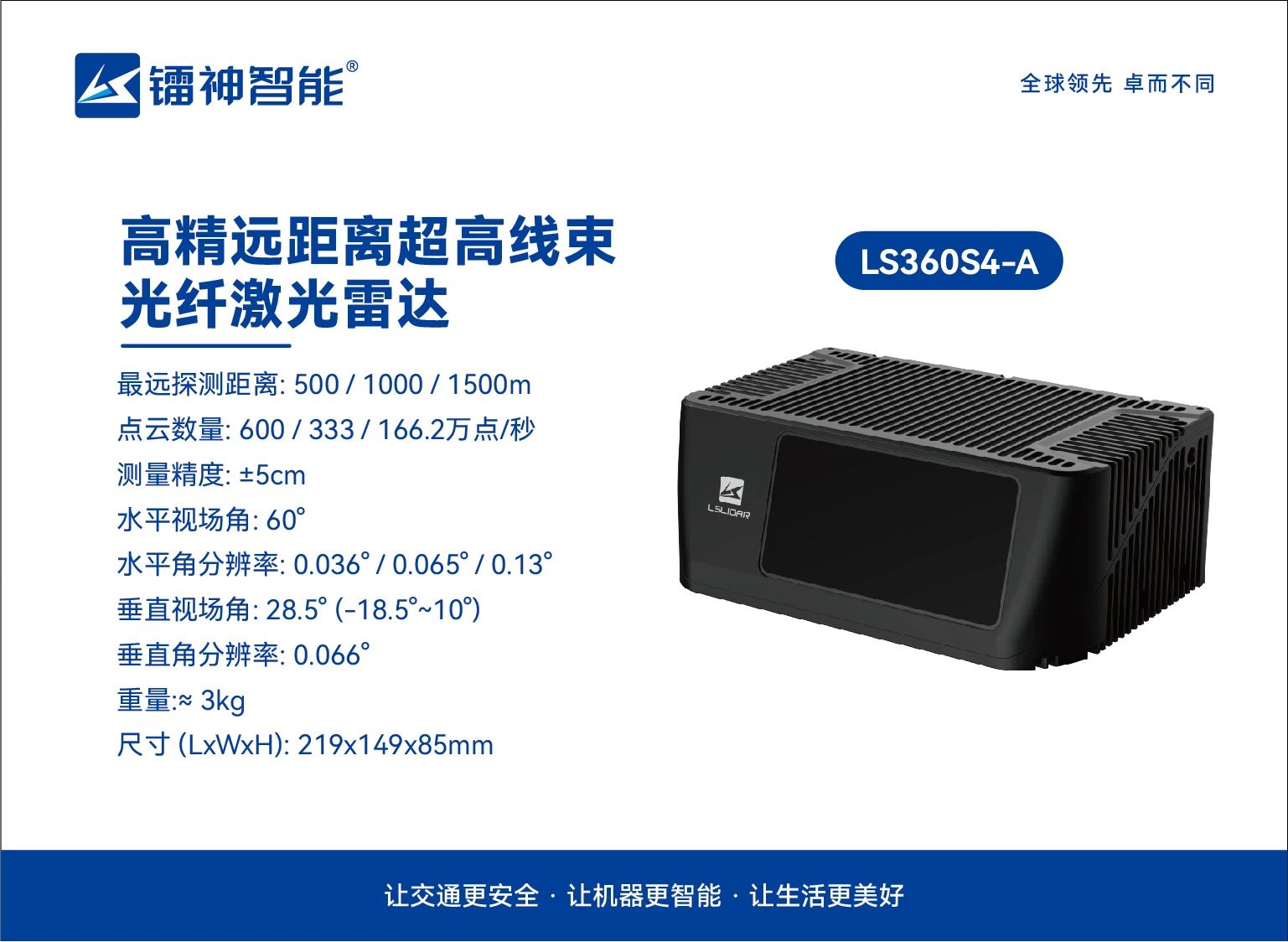 核心優(yōu)勢:遠(yuǎn)距·高分辨率·高幀率 超遠(yuǎn)探測,精準(zhǔn)無憂:采用自研自產(chǎn)1550nm光纖激光器,最遠(yuǎn)探測距離達(dá)1500米,測量精度±5cm,輕松應(yīng)對復(fù)雜環(huán)境挑戰(zhàn)。 高幀率動(dòng)態(tài)捕捉:幀率可達(dá)10~20Hz,搭配最高500線掃描能力,點(diǎn)云數(shù)量突破600萬點(diǎn)/秒,動(dòng)態(tài)目標(biāo)無所遁形。 極致分辨率:最小水平角分辨率達(dá)0.036°,垂直視場角分辨率可達(dá)0.04°,細(xì)節(jié)感知能力行業(yè)領(lǐng)先。 全能型號,靈活適配 LS-S4系列提供多款型號,滿足多樣化場景需求: 應(yīng)用場景:從城市到低空,全面覆蓋 LS-S4系列已成功應(yīng)用于: 低空管控:實(shí)時(shí)監(jiān)測追蹤入侵無人機(jī),保障低空飛行安全 ?eVTOL/飛行汽車/直升機(jī)防撞:遠(yuǎn)距離探測感知前方細(xì)小障礙物,保障飛行安全。 無人系統(tǒng)裝備:為無人車、無人船、無人艇等裝備提供高精環(huán)境感知,實(shí)現(xiàn)無人駕駛及安全避障。 軌道交通:軌道異物侵限識別,保障行車安全。 智慧城市:交通流量監(jiān)控、橋梁防撞預(yù)警。 定制化服務(wù),專屬您的需求 鐳神智能支持參數(shù)靈活定制,包括探測距離、掃描模式(均勻/ROI)、線束配置、垂直視場角等,助力客戶精準(zhǔn)匹配應(yīng)用場景。 立即咨詢鐳神智能銷售團(tuán)隊(duì),獲取LS-S4系列詳細(xì)方案! 遠(yuǎn)見·智感·未來 鐳神智能,以千米級激光雷達(dá)技術(shù)賦能全球智能化升級! 24小時(shí)全國服務(wù)熱線:4008306266 激光雷達(dá)中文官網(wǎng):www.168art.cn 激光雷達(dá)英文官網(wǎng):www.lslidar.com 無人叉車中文官網(wǎng):www.leishenrobot.cn 總部地址:深圳市寶安區(qū)沙井街道沙四東寶工業(yè)區(qū)R棟廠房 無人系統(tǒng)基地:深圳市寶安區(qū)環(huán)鎮(zhèn)路智薈先進(jìn)制造產(chǎn)業(yè)園 徐州工廠:徐州市睢寧縣徐州空港經(jīng)濟(jì)開發(fā)區(qū)安瀾大道東,臨空大道北S05廠房 濟(jì)南工廠:山東省濟(jì)南市歷城區(qū)智能傳感器產(chǎn)業(yè)園A9棟 重慶工廠:重慶市巴南區(qū)界石鎮(zhèn)石桂大道16號4幢2-1