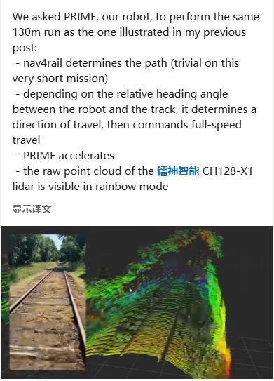 法國國家鐵路公司(SNCF)的 PRIME 鐵路機器人,在軌道交通自動駕駛的障礙物檢測方面,取得了令人振奮的進展,而這一成果背后,鐳神智能激光雷達發(fā)揮了關鍵作用。