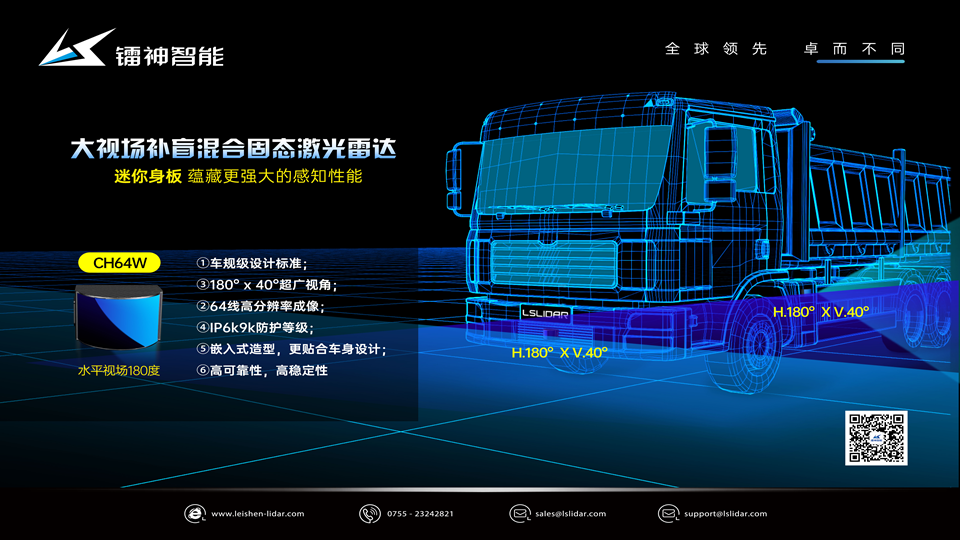 另外,現(xiàn)場(chǎng)還展示了鐳神智能另一重磅新品——大視場(chǎng)補(bǔ)盲激光雷達(dá)CH64W,作為專為掃除盲區(qū)設(shè)計(jì)的產(chǎn)品,CH64W可應(yīng)用在汽車、機(jī)器人、AGV等領(lǐng)域的行駛盲區(qū)監(jiān)測(cè),其擁有180°x 40°的超廣水平視場(chǎng)角,測(cè)量精度精確至±3cm,能夠高效識(shí)別近距離范圍內(nèi)的障礙物。與鐳神智能其他功能的激光雷達(dá)組合搭配,適配不同應(yīng)用需求,提供更精確、全面的監(jiān)測(cè)感知。