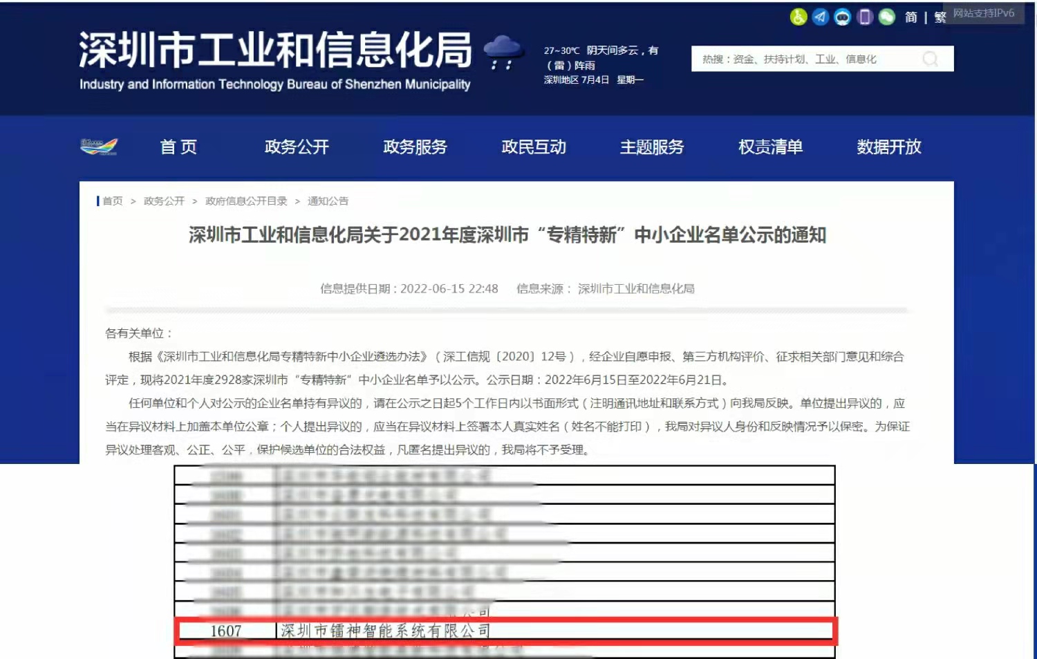 2022年6月,深圳市工業(yè)和信息化局發(fā)布了《關(guān)于2021年度深圳市“專(zhuān)精特新”中小企業(yè)名單公示的通知》,通知顯示,深圳市鐳神智能系統(tǒng)有限公司(以下簡(jiǎn)稱(chēng)鐳神智能)通過(guò)了層層審核,憑借強(qiáng)大自主的研發(fā)能力獲得了深圳市“專(zhuān)精特新”中小企業(yè)認(rèn)定!