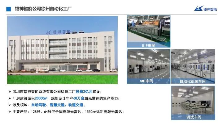 這個是我們的廠房,以及自動化產(chǎn)線,規(guī)劃年產(chǎn)68萬臺的車規(guī)激光雷達(dá)。鐳神的雷達(dá)不光用在汽車?yán)锩?,整個汽車相關(guān)的,公路的智慧交通我們也設(shè)計,我們其實還做了國內(nèi)最多的車路協(xié)同的落地的解決方案應(yīng)用案例,還有軌道、水運(yùn)、航空,大基建大交通,服務(wù)機(jī)器人,工業(yè)自動化,測繪、安防還有一些特殊應(yīng)用。