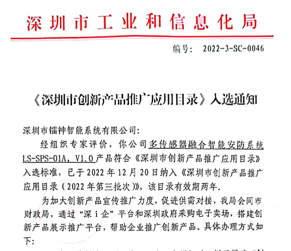 近期,深圳市工業(yè)和信息化局(以下簡(jiǎn)稱深圳市工信局)公布的《深圳市創(chuàng)新產(chǎn)品推廣應(yīng)用目錄(2022年第三批)》中, 鐳神智能多傳感器融合智能安防系統(tǒng)成功入選。