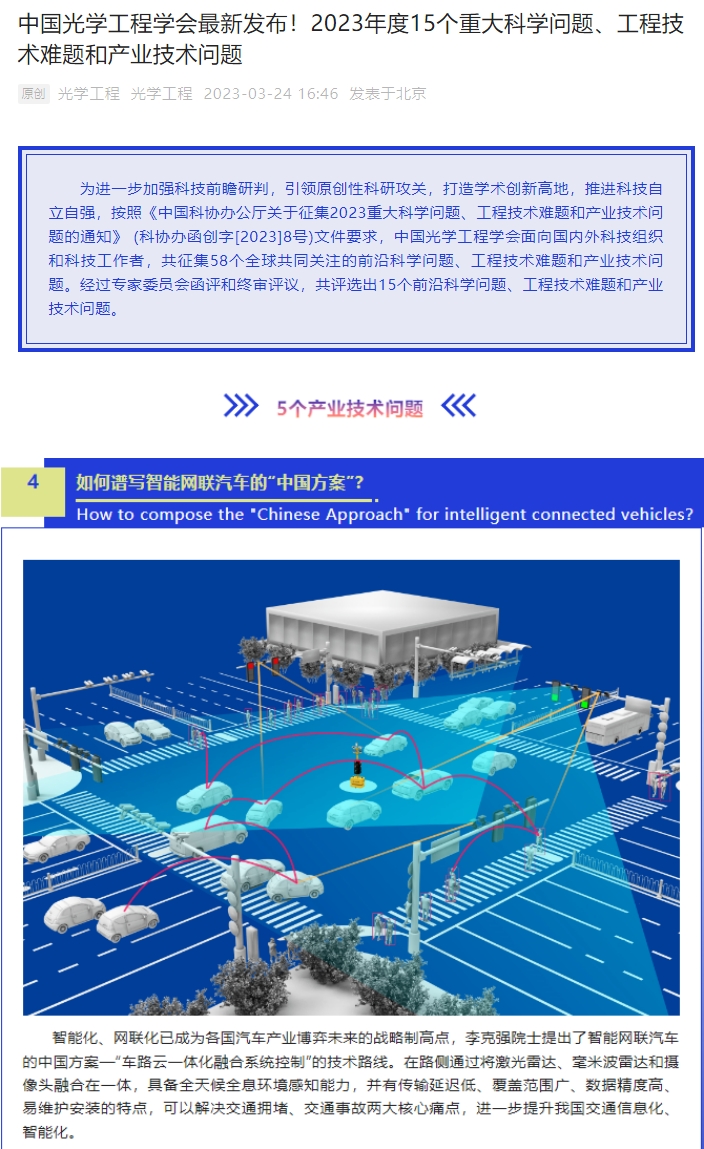 為進(jìn)一步加強(qiáng)科技前瞻研判,引領(lǐng)原創(chuàng)性科研攻關(guān),推進(jìn)科技自立自強(qiáng),中國光學(xué)工程學(xué)會(huì)根據(jù)《中國科協(xié)辦公廳關(guān)于征集2023重大科學(xué)問題、工程技術(shù)難題和產(chǎn)業(yè)技術(shù)問題的通知》,開展光學(xué)工程及相關(guān)領(lǐng)域前沿科學(xué)問題、工程技術(shù)難題和產(chǎn)業(yè)技術(shù)問題征集工作。鐳神智能憑借“ 如何譜寫智能網(wǎng)聯(lián)汽車’中國方案’”的議題成功通過中國光學(xué)工程學(xué)會(huì)的終評(píng)!