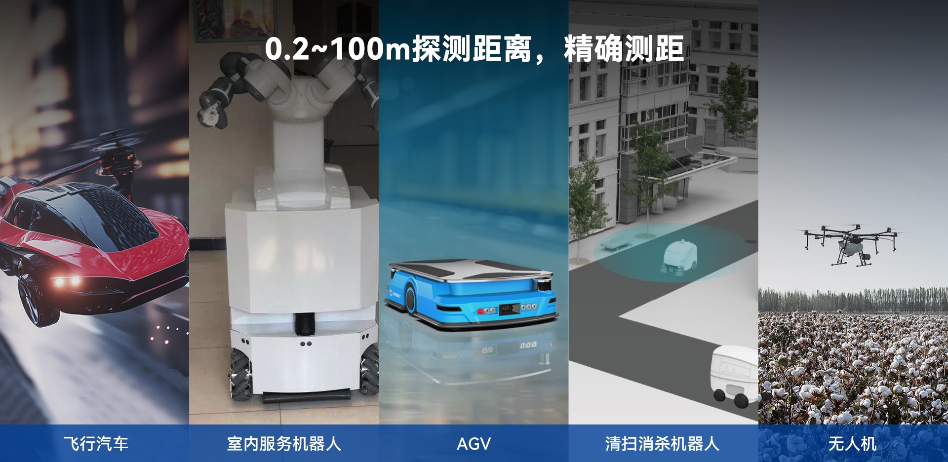 主要應用于飛行汽車、室內(nèi)服務機器人、AGV、清掃消殺機器人、無人機等需要精確測距和避障的應用場合。